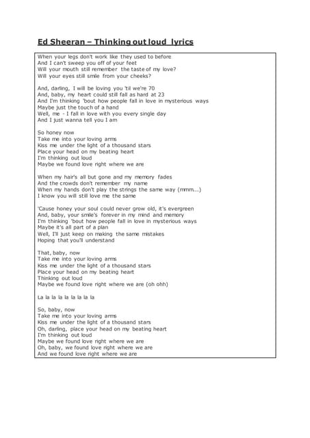 Ad Free Shipping Available. Lirik Lagu Thinking Out Loud dan Terjemahan - Ed Sheeran. Ed Sheeran - Thinking Out Loud lyricsWhen your legs dont work like they used to beforeAnd I cant sweep you off of your feetWill your.